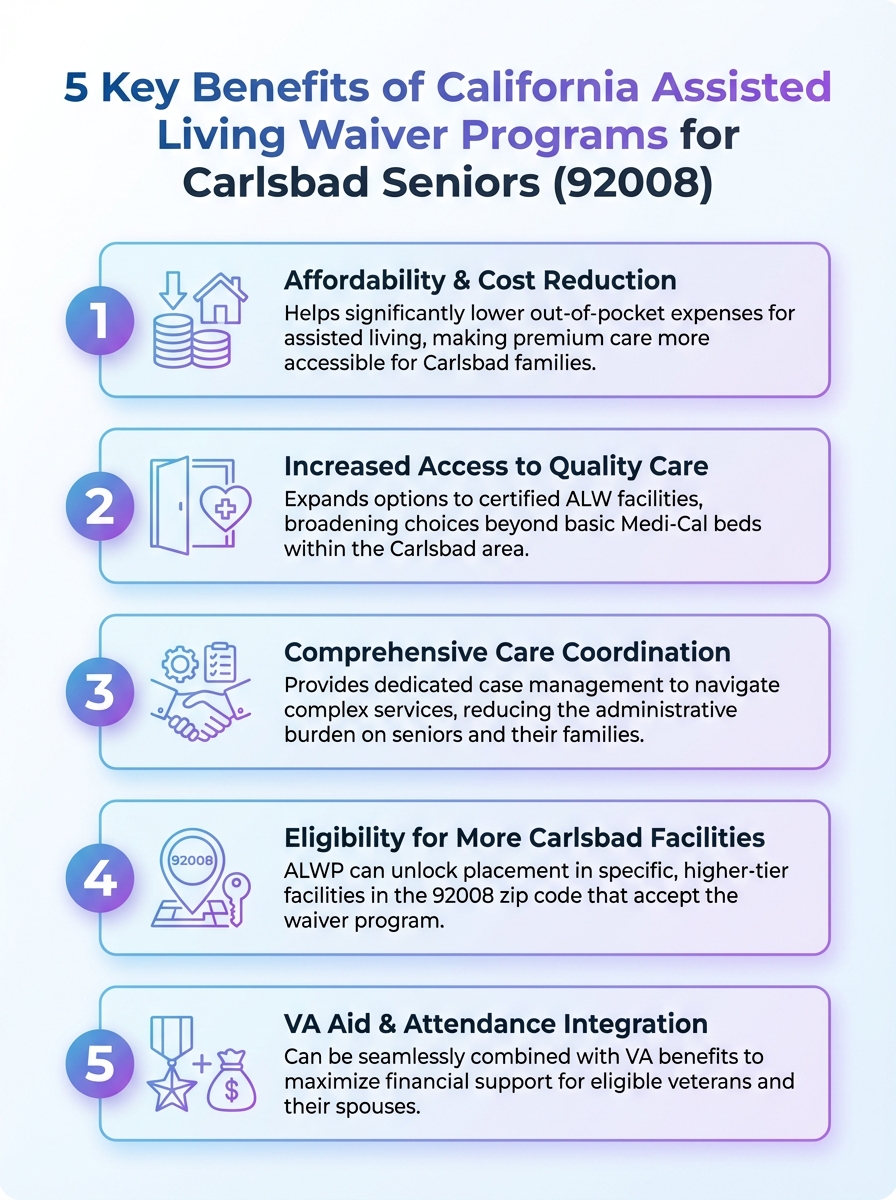 This infographic highlights five benefits of California’s assisted living waiver programs for Carlsbad seniors (92008). A quick reference for families considering care options.