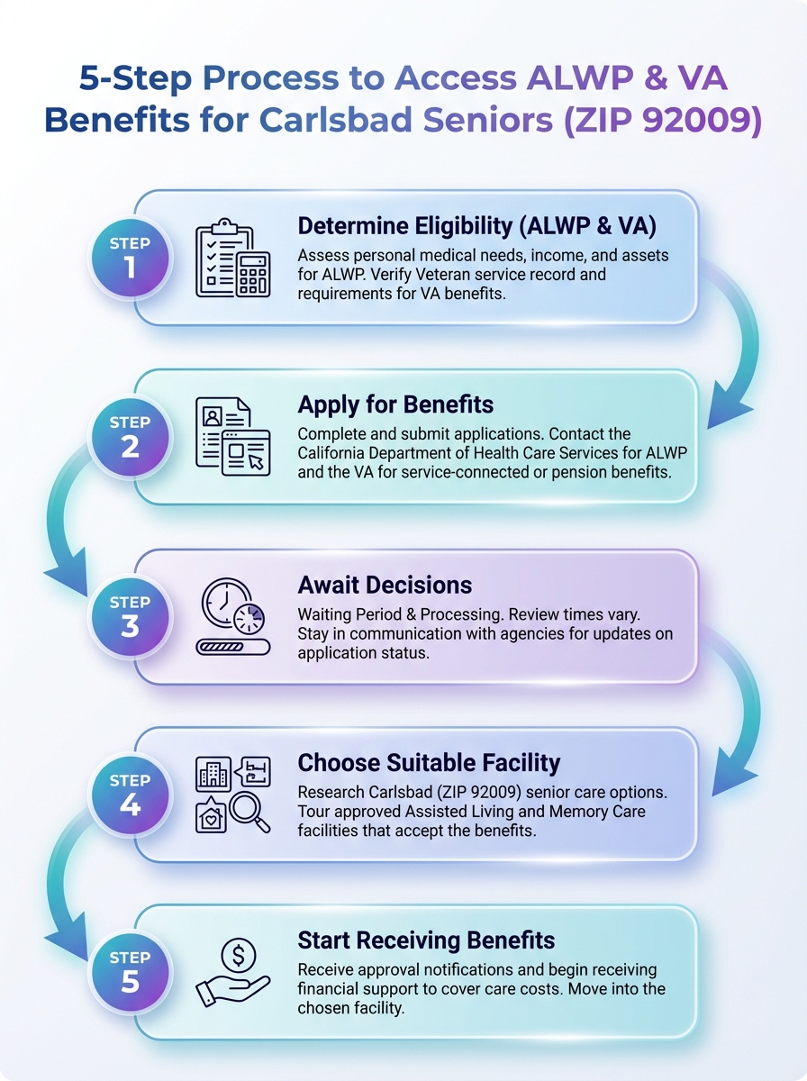 This infographic outlines a simple 5-step path to accessing ALWP and VA benefits for Carlsbad seniors in ZIP 92009. Learn who qualifies and how to apply.